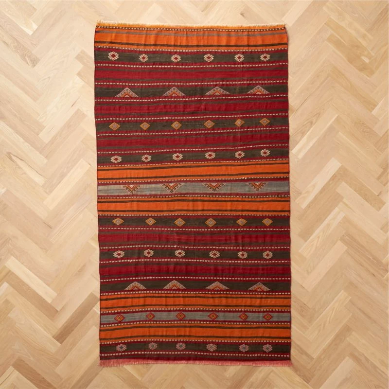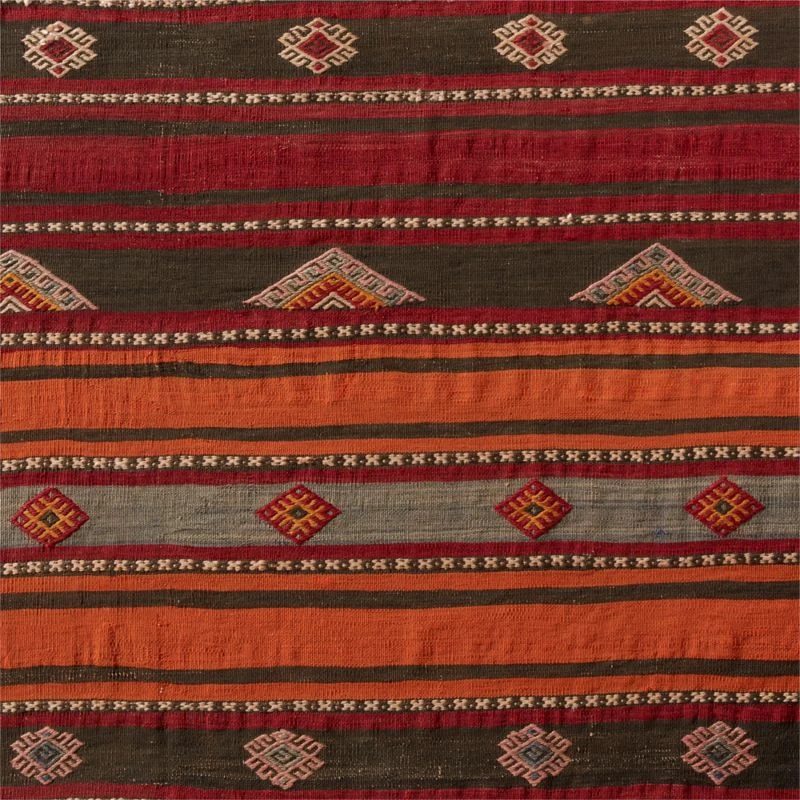 One-of-a-kind vintage rug handwoven by skilled artisans decades ago in the Aegean region of Turkey. Deep tones of red, orange and washed teal are edged in lush 2″ fringe. Lightweight rug is suited for high-traffic areas.